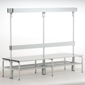 Banc de vestiaire PMR – Banc de vestiaire spécialement étudié pour les sportifs à mobilité réduite. L’assise de dimensions 100 x 60 cm est escamotable pour libérer l’espace et donner l’accès aux fauteuils. Un loquet de blocage maintient la tablette en position haute quand elle est relevée. Châssis en tube acier carré 30 x 30 mm thermolaqué. Double tablette de rangement pour les effets personnels. L’assise et les tablettes sont en HPL (résine). Dimensions : largeur 100 cm, profondeur 60 cm, hauteur 140 cm.